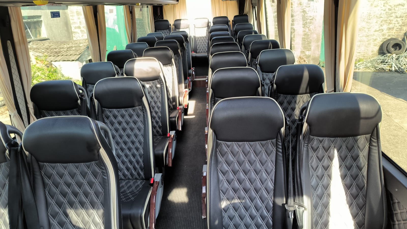 Our coaches feature leather seats, power outlets, and privacy partitions.